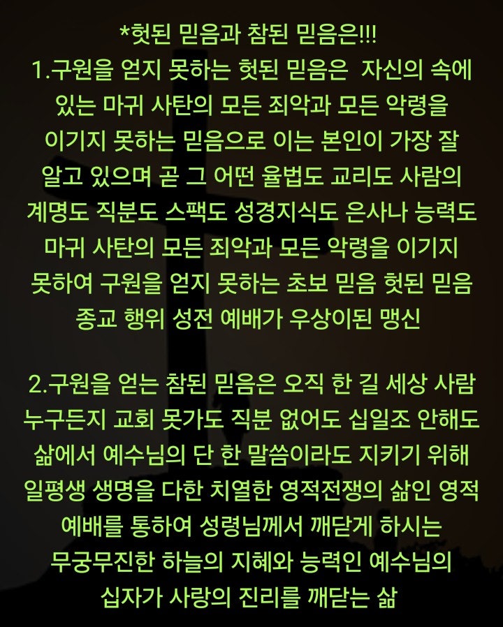 세상 사람 누구든지 목사 장로 권사 집사 직분 없어도 교회 못다녀도 성경 지식 없어도 십일조 안해도 삶에서 삶에서 예수님의 단 한 말씀이라도 지키기 위해 대적하는 마귀 사탄의 모든 죄악과 모든 악령과 일평생 생명을 다한 치열한 영적 전쟁의 삶인 영적 예배를 통하여 때가 되어 그 단 한 말씀이